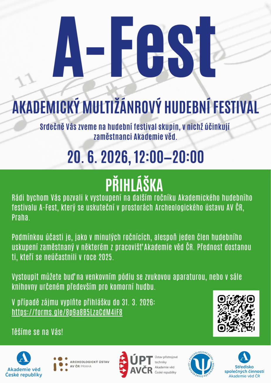 Rádi bychom Vás pozvali na další ročník Akademického hudebního festivalu A-Fest (http://a-fest.avcr.cz/), který se i letos bude konat v prostorách Archeologického ústavu AV ČR, Praha, a to v sobotu 20. června 2025, 12:00 – 20:00. Vstup je zdarma (brankou u tramvajové zastávky Malostranská).